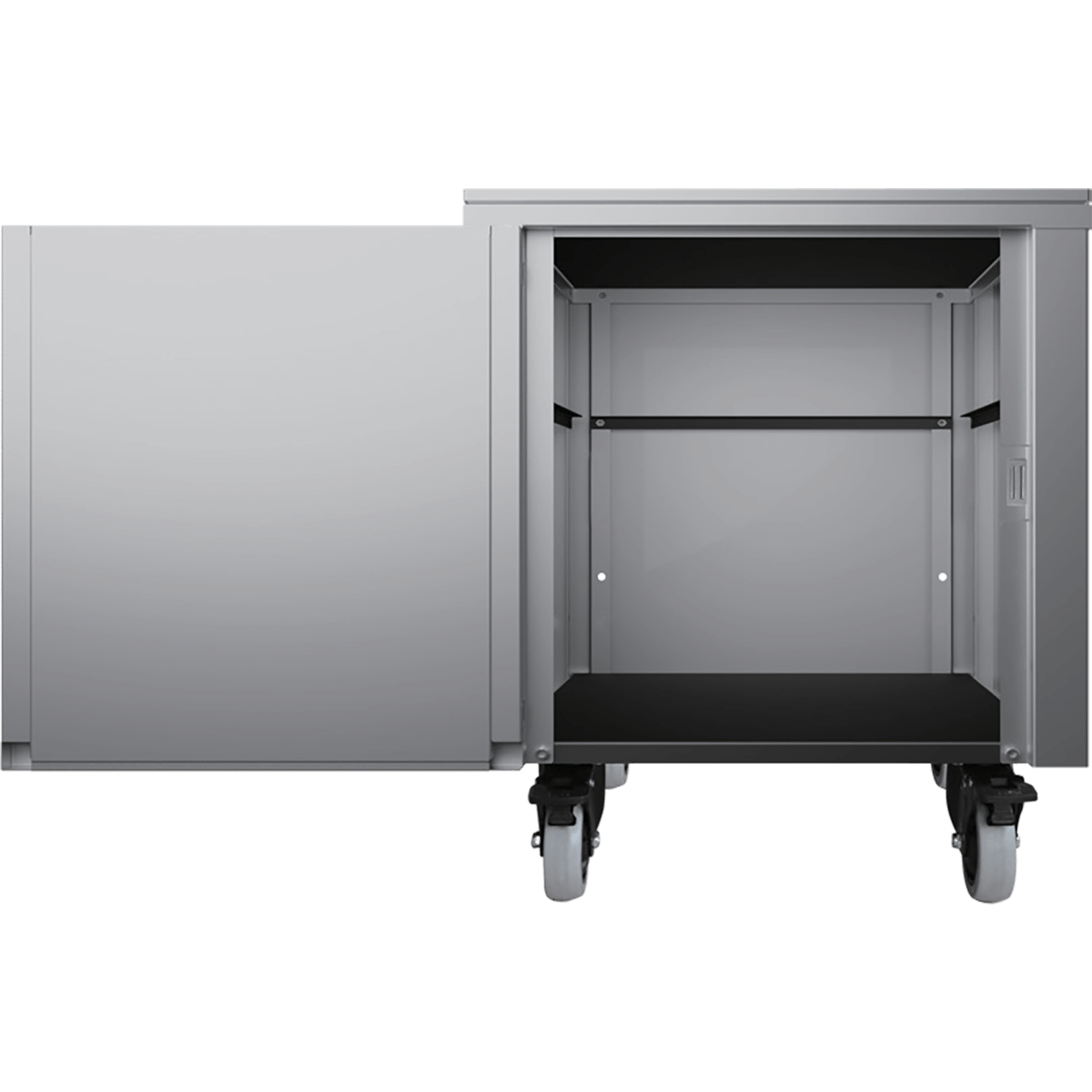 The cart is built entirely of food grade stainless steel ideal for foodservice environments. The large cabinet is 7 cubic feet of storage.